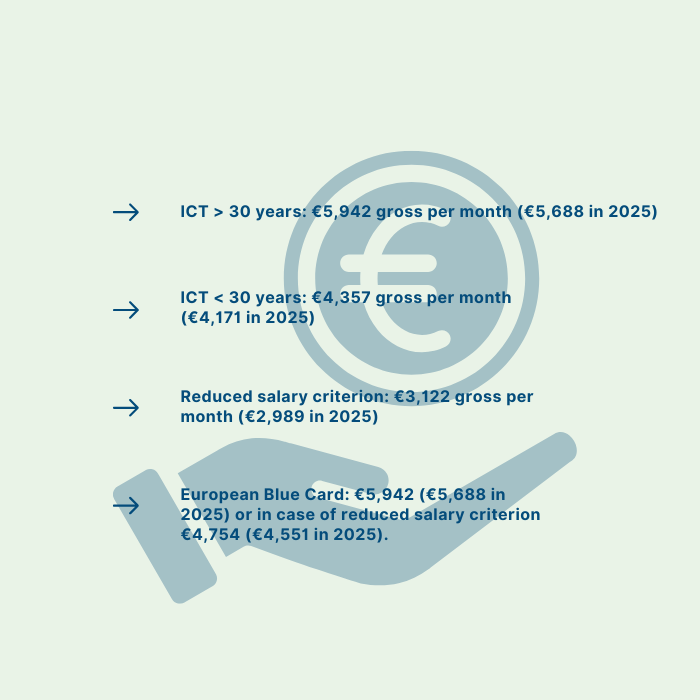 - Highly skilled migrant and ICT < 30 years: €4,357 gross per month (€4,171in 2025)